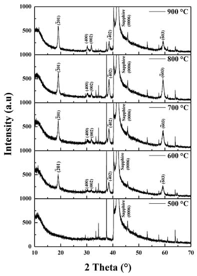 X-ray diffraction patterns of post-annealed β-Ga2O3 thin films with various temperature ranges from 500 to 900 °C in the furnace.