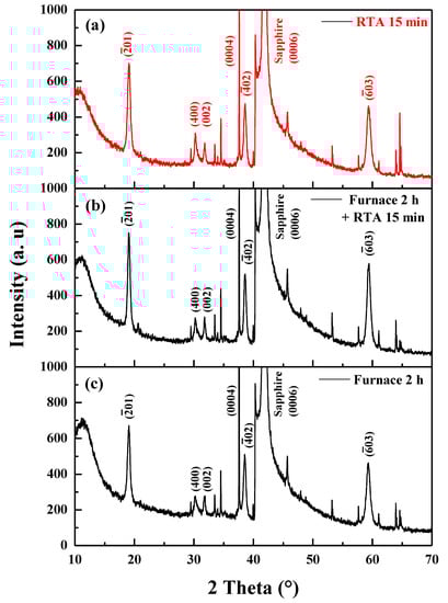 X-ray diffraction patterns of β-Ga2O3 thin films proceeded at various annealing methods: (a)—RTA 15 min at 900 °C, (b)—furnace 2 h + RTA 15 min, and (c)—furnace 2 h.