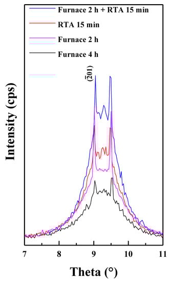 Figure 4 shows the HRXRD rocking curve of the (−201) peak reflection by various annealing processes at 900 °C. β-Ga2O3 (−201) was obtained from 2θ at 19.07°. Thus, the measurement was carried out using HRXRD from 6° to 12°. As shown in the HRXRD results, it seems that the observed peaks were separated. Multiple peaks were observed by the rocking curves of the (−201) peak. We believe that these split multiples of the (−201) rocking curves probably come from the monoclinic phase of β-Ga2O3. Since β-Ga2O3 thin films were prepared by sol–gel and a spin-coating method, they did not have an epitaxial structure. However, by comparison of the FWHM value, we have confirmed that the β-Ga2O3 thin films have a crystalized phase with relatively high orientational structure properties. However, when comparing the tendency of the half width by the rocking curve of furnace 2 h and furnace 2 h + RTA 15 min, it was confirmed that the crystal growth was better in the (−201) direction when post annealing was applied.
