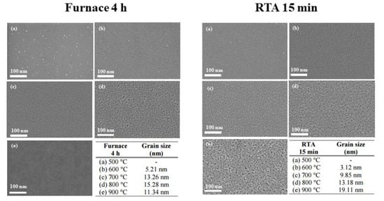 Figure 6 shows the FE-SEM images of β-Ga2O3 thin films prepared at (a) 500 °C, (b) 600 °C, (c) 700 °C, (d) 800 °C, and (e) 900 °C using different annealing methods: furnace 4 h and RTA (non-furnace). In the furnace 4 h process, we could see the tendency of the grain size to increase by up to 800 °C, but at 900 °C, we could see that the grain size became smaller as a result of excessive sintering. Whereas, in the case of RTA annealing without the furnace, as shown by the FE-SEM image, the grain size is increasing as the temperature rises. In addition, both annealing processes were identified as amorphous at 500 °C (Figure 6a), and the grain was gradually formed from 600 °C (Figure 6b). As a result, the β-phase was confirmed above 700 °C in both processes. In addition, the grain size increased as the temperature increased. In addition, when measuring the grain size, it was analyzed that the RTA and furnace processes were similar in size. It seems that increasing the annealing temperature can affect the grain growth more essentially. Therefore, RTA is an annealing process that can replace the furnace to form a β-Ga2O3 thin film.