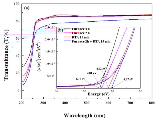 (a) Transmittance spectra and (b) Tauc plots of β-Ga2O3 thin films prepared at 900°C in various annealing processes: furnace 2 h, furnace 2 h + RTA 15 min, furnace 4 h, RTA 15 min.