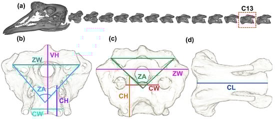 Tri-view measurement of the cervical spine. (a) C1-C14 cervical vertebrae. The front view (b), rear view (c) and side view (d) of C13. VH: vertebral height; ZW: zygapophyseal width; ZA: zygapophyseal angle; CH: centrum height; CW: centrum width; CL: centrum length.