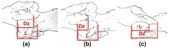 Schematic diagram showing the measurement of Zygapophyseal overlap for the adjacent facet. Dz: The amount of postzygapophyseal overlap with reference to the prezygapophysis. (L: The length of the prezygapophysis. (a) Two vertebrae in the normal state. (b) The state of the two vertebrae during ventroflexion. (c) The state of the two vertebrae during dorsiflexion.