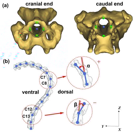 To measure the angle between adjacent cervical vertebrae, four points at the caudal end of the intervertebral foramen and four points at the cranial end of the intervertebral foramen are selected for each cervical vertebra (As shown in Figure 3a). The central blue point is calculated as the mean position of the four green points. The two central blue points at the caudal end and cranial end of the intervertebral foramen are connected to represent the transient position of each vertebra on the sagittal plane. Thus, the included angle between two adjacent vertebrae on the sagittal plane can be obtained, as shown in Figure 3b. The joint angle symbol is defined as “+” when the cranial vertebra is reversed to the ventral side with respect to the caudal vertebra, and “−” when the cranial vertebra is reversed to the dorsal side with respect to the caudal vertebra. Take the C7/C8 segments as an example, α represents the angle of C7 moves relative to C8, which is positive “+”. On the other hand, take C12/C13 segments as an example, β represents the angle of C12 moves relative to C13, which is negative “−”.