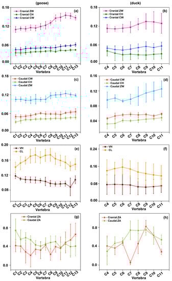 The cranial and caudal parameters, including ZW, CH, CW, VH, CL, and ZA of five geese and five ducks, were obtained. The measured parameters of the cervical spine of geese and ducks are shown in Figure 4. (Figure 4a,c) shows that the fluctuation of CH and CW of the cervical spine from the cranial end to the caudal end is not significant, while ZW shows a gradual upward trend from C7 to C13, then with a downward trend from C13 to C15. (Figure 4e) shows that CL gradually increases from C3 to C7 and then decreases from C10 to C14. However, the overall trend of VH is gradually decreasing. (Figure 4g) indicates that the cranial ZA shows a short decreasing trend from C3 to C6 and a gradually increasing trend after C10. The caudal ZA also shows a decreasing trend from C3 to C6, similar to the cranial ones, and then fluctuated gently.
