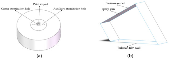The 3D model of air cap of spray gun was established in SolidWorks software (2014). In this simulation experiment, the spray flow field is conical, so the fan control hole in the original actual model is omitted [24]. A 3D model is shown in Figure 1a. The central hole of the air cap is the spray pinhole and the coating inlet, and the aperture is 0.8 mm. The annular central atomizing hole is outside the central hole of the air cap, with an outer diameter of 2 mm and an inner diameter of 1.6 mm. There are two auxiliary atomizing holes on both sides of the central atomizing hole, and the aperture is 0.5 mm.