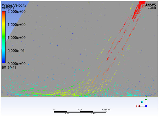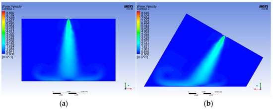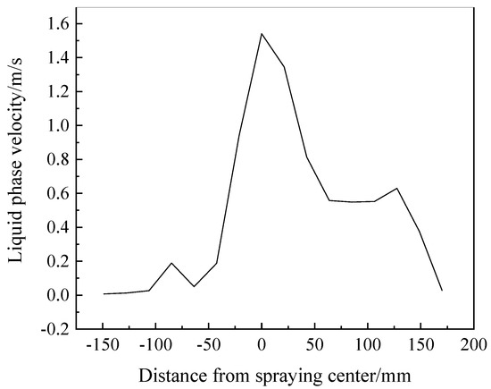 There was no significant difference in the distribution of the fog field between oblique spraying and vertical spraying in the first half of droplet transportation. The influence of spraying angle on the fog field distribution mainly occurs at the final stage of liquid transportation, as shown in Figure 3. Before the droplet collides with the workpiece, the droplet will diffuse in the X and Z directions under the action of airflow, as shown in Figure 3b. Compared with the liquid velocity distribution of dip angle spraying and vertical spraying, it is obvious that, under the action of dip angle, there are more droplets diffused in the X direction and the velocity is larger, which may affect the uniformity and quality of the coating during dip angle spraying. In order to further analyze the fog field near the surface of the workpiece, the velocity vector distribution of the liquid phase at 20 mm from the wall of the workpiece in Figure 4 was studied, and the velocity curve of the fog field shown in Figure 5 was obtained.