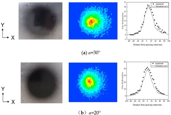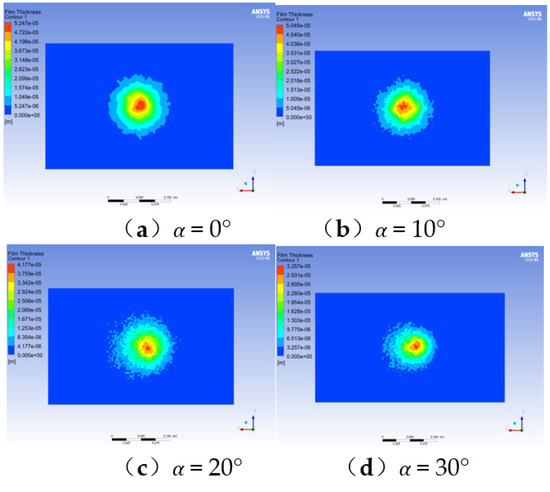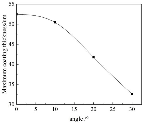 It can be seen from Figure 8 that the coverage area of the coating film gradually increases with the increase in the spray inclination, and the maximum coating film thickness decreases in an approximately parabolic manner.