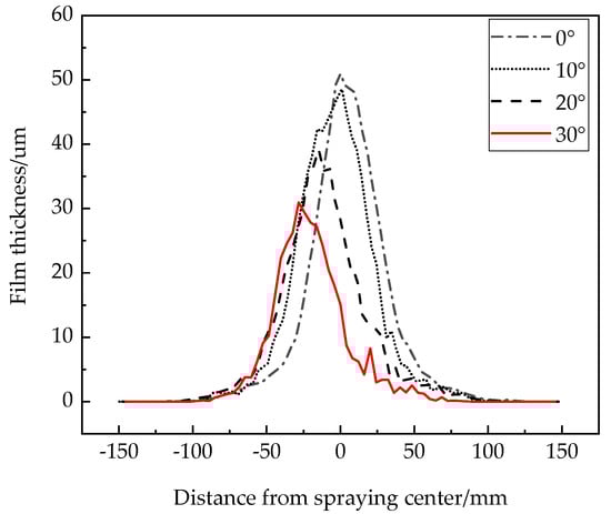 It can be seen from Figure 7 that the coating thickness distribution curve shows an uneven trend with the increase in spray angle. Thus, the existence of spray angle will lead to an uneven distribution of the coating. When the spraying inclination angle exceeds about 20°, the excessively large inclination angle will cause the droplets to spread under the action of the gas field, and the uniformity of the coating film distribution will become worse, resulting in more obvious sudden changes in the curve.