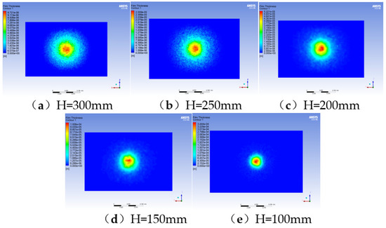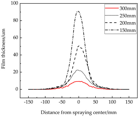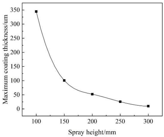 With the increase in spraying height, the maximum coating thickness decreases in an approximately inverse function. The variation of the maximum film thickness is sensitive when the spraying height is between 100 mm and 150 mm, as shown in Figure 11.