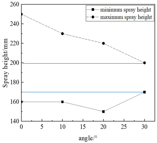 It can be seen from the above figure that with, the increase in spraying angle, the adjustable range of spraying height gradually becomes smaller. The vertical spraying height can be adjusted from 250 to 160 mm. The maximum spraying height is obviously affected by spraying angle. With the increase in spraying angle, the maximum spraying height gradually decreases, and the minimum spraying height first decreases and then increases. With the decrease in spraying height, the adjustable range of spraying angle is larger. When the spraying height is between 200 and 170 mm, the spraying angle can be adjusted from 0° to 30°.