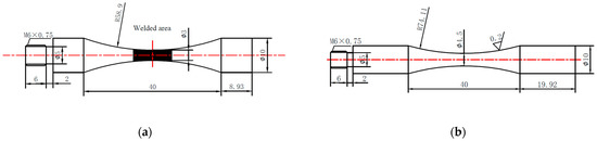 A very high cycle fatigue test was carried out on the Shimadzu USF-2000 ultrasonic fatigue testing machine (Shimadzu, Kyoto, Japan) at a resonance frequency of 20 kHz and stress ratio R = −1. The thermal effect was not obvious for the large specimen, so the resonance time and interval time were set to 200 ms: 200 ms. For the welded specimen, the use of 200 ms: 200 ms intermittent ratio was likely to cause specimen burning due to the thermal effect, so the resonance time and interval time were set to 200 ms: 600 ms to give the specimen better heat dissipation. During the test, compressed cold air was used to cool the specimen until fatigue failure of the specimen occurred or up to 109 cycles. The shape and dimensions of the specimens are shown in Figure 3. Among them, the welded specimen is shown in Figure 3a, and the minimum diameter was 3 mm. The large specimen is shown in Figure 3b, and the minimum diameter was 4.5 mm. The normal specimen was the same size as the welded specimen, while the welded specimen was taken from a welded plate. The weld zone was located at the minimum diameter of the specimen after processing. Specimens were polished by 2000 mesh sandpaper before the test. The maximum stress during the test was located in the minimum section of the specimen.