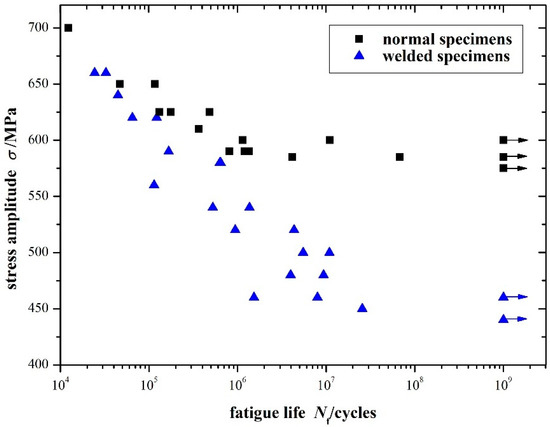 Similarly, we obtained the very high cycle fatigue S-N curve of the welded specimen and compared it with the S-N curve of the normal specimen previously obtained, as shown in Figure 5. It was found that the fatigue strength of the welded specimen was lower than that of the normal specimen. Fatigue failure mainly occurred below 107 cycles, which did not show the characteristics of the continuous decline in the very high cycle fatigue regime. The fatigue limit was observed, which was about 450 MPa.