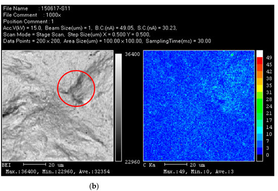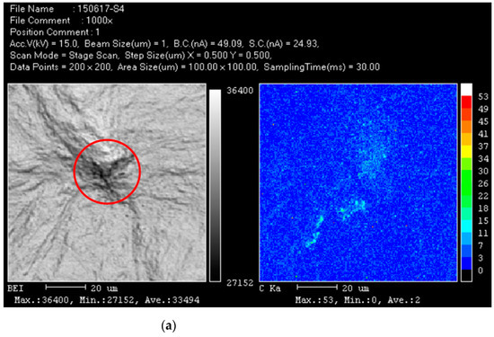 We found that the carbon element content in the fatigue source area was relatively high in the previous fracture microstructure analysis. In order to observe the influence of the carbon element more intuitively, we analyzed the distribution of the carbon element around the fatigue source area of the internal crack initiation using an electron probe, as shown in Figure 12. It was found that the enrichment of carbon elements around the fatigue source area was more obvious, which proved that the carbon element promoted the formation of the GBF.