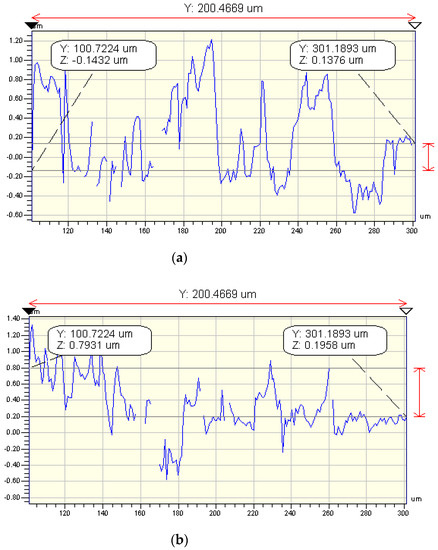 We measured the surface roughness of the specimens using a white light interferometer. The values of a and 2b were obtained, as shown in Figure 14. Then, was calculated using Equation (2), and the fatigue strength of Murakami model was obtained, as shown in Table 4.