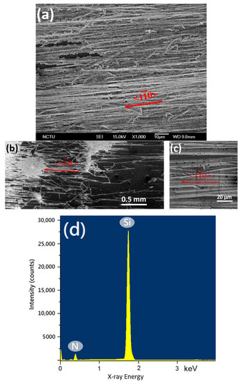 Figure 1a shows a typical SEM micrograph of the nitrided SiO2/Si (110) substrate after 10 min nitriding. The surface morphology shows that Si3N4 crystallites exhibit a fiber-like characteristic with an average diameter of about 1–2 μm and a length of >0.1 mm. Those Si3N4 microfibers are predominately aligned in parallel with each other and approximately along the specific direction of Si []. For 20 min nitridation, the length of the microfibers can be as long as 2 mm and the diameter can increase to 5–10 μm, as shown in Figure 1b,c. A few areas on the nitrided substrate are covered with highly dense microfibers. The microfibers shown in Figure 1c exhibit a prism-like morphology, and most of the microfibers are aligned nearly with their longitudinal directions Si [] in addition to a few deviated ones. The faceted morphology suggests that the microfibers are of the crystalline phase. Furthermore, X-ray energy dispersive spectroscopy shows that those microfibers consist of Si and N, as shown in Figure 1d, with the absence of O, implying that SiO2 may not exist anymore after nitriding.