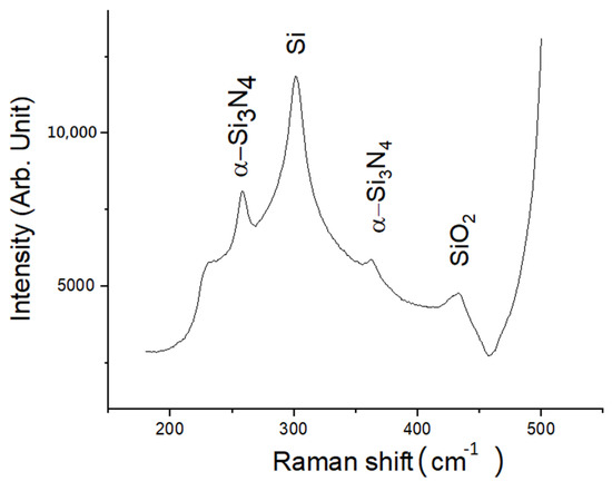 Raman spectra from different areas on the SEM images shown in Figure 1 were acquired in micromode. A typical Raman spectrum acquired from the microfibers is shown in Figure 2 from 150 to 450 cm−1. The Raman peaks observed at 259 and 363 cm−1 are identified to belong to α-Si3N4 [22]. The Raman peak at 300 cm−1 is the characteristic signal of Si in second order [23,24]. As no β-Si3N4 characteristic peaks are observed, it is evident that all the microfibers are of the α-Si3N4 phase. On the bare area without coverage of the Si3N4 crystallites as shown in Figure 1b, neither Si3N4 nor SiO2 Raman signals can be observed, implying that SiO2 after nitridation might transform to Si3N4, or be etched away by the plasma containing hydrogen. Many of the glass vibrations are known to occur between 400–700 cm−1 (bridging Si-O-Si vibrations) which are not seen in the spectrum [24].