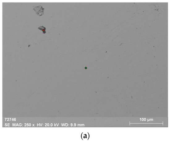Figure 7 shows a micrograph of the sample surface (Figure 7a) with spectra obtained by energy dispersive X-ray spectroscopy (EMF, Hitachi High-Tech Corporation, Kawasaki City, Japan) (Figure 7b,c).