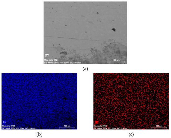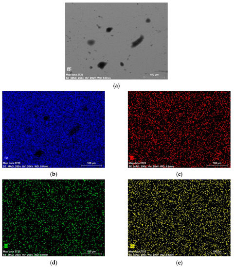 A micrograph of the surface of the initial steel sample obtained by registering backscattered electrons, as well as maps of elements are shown in Figure 6a–h.