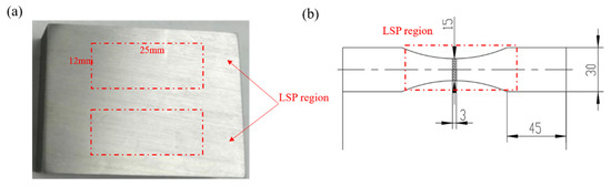 The chemical composition of TC6 titanium alloy is listed in Table 1. The size of the samples was 30 mm× 30 mm× 10 mm, and the 25 mm× 12 mm areas outlined by the red dashed line were strengthened by LSP, as shown in Figure 1a. The fatigue test regions are shown in Figure 1b. The samples were cut by machine, and the original surface roughness Ra was measured as better than 0.8 μm. After machining the samples, they were pretreated by grinding and polishing. The processed surfaces of the samples were cleaned with alcohol and dried with cold air to ensure uniform roughness. Finally, LSP was performed on the entire gauge length section within the red dashed frame.