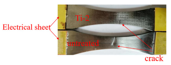Titanium alloy is sensitive to stress concentration [,], and we pasted an electrical sheet in the holding section, as shown in Figure 3. In order to test fatigue performance, a QBG-100 high-frequency fatigue testing machine (Dalian Longrun Technology Co., Ltd., Dalian, China) was performed at room temperature under 150 Hz. The loading stress was from 500 MPa to 580 MPa. Under the action of continuously alternating load produced by the shaker, the fracture toughness test was carried out on the specimens to test the crack growth rate and the fracture threshold value of TC6 alloy. The stress ratio was 0.1, when the vibration frequency of the excitation system was equal to the natural frequency of the system itself. The system resonates, and the small excitation force generated is amplified and acted on the specimen during the material fatigue test.