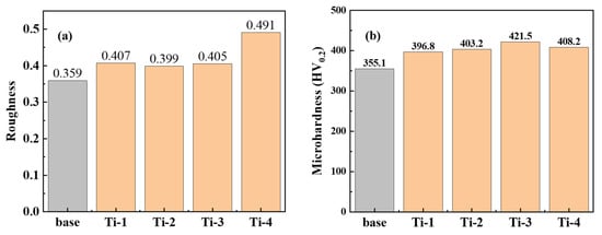 The difference of surface roughness and microhardness between specimens is shown in Figure 5. Surface roughness was used to reflect the effect of LSP on surface flatness. The results show that the surface roughness Ra increases as the plasticity increases. However, this relationship is not linear. Only the roughness of Ti-2 is less than 0.4 μm, yet the values of Ti-1 and Ti-3 are increased by 12.8% and 13.3%. In the engineering field, the flatness should be controlled in safe limits, because the rough surface would have a negative result in service life. By two impacts, the surface roughness of Ti-4 has increased to 0.491 μm, which is inappropriate for enhancing the surface. In fact, the altering of roughness consists of two periods although the LSP process is instantaneous. Firstly, the shock wave contacting with TC6 would cause local deformation, and roughness and heterogeneity rise in this process. Subsequently, the plastic deformation occurs, and the surface roughness decreases []. Lastly, the roughness is marginally increased.