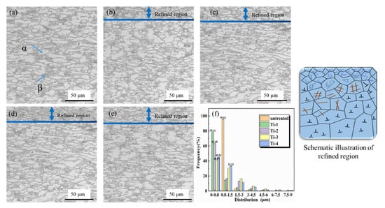 In Figure 6a, the black regions represent hexagonal close-packed (hcp) α phases. Near the boundaries, the white regions are body-centered cubic (bcc) β phases. Figure 6b–e indicate that, differing from the energy density, the thickness of the refined region is clearly different. The strengthening effect of Ti-2 and Ti-4 is better, for their thickness layers are thicker than Ti-1 and Ti-3. Hence, the power density of 3.69 GW/cm2 was sufficient for TC6. However, there is no phase transformation in LSP process. Besides, the dislocations began to grow and move along the boundaries during the LSP procedure so as to achieve the action of surface strengthening. The surface strengthening is realized by plastic deformations while the surface is impacted by a high-pressure shock wave. The grains have been refined in the surface. As Figure 6f indicates, the LSP has changed the grains distribution [], and the most profound effect was reflected in Ti-1 and Ti-2. Compared to the untreated specimen, the proportion of grain size α phases below 0.8 μm has reached 78% and 65%, respectively. For the β phases, which were needle-shaped, the grain size could not be calculated. Under the condition of 6 J pulse energy, the fine refinement was about 40%. Similarly, the proportion after two impacts becomes 45% approximately, which is 44% lower than that of Ti-2. This result shows that the LSP has changed the microstructures of TC6. The distribution of the impact area gradually increases with the power density. Nevertheless, the increase of power density and impact number are close to saturation. The fine grains produced by plastic deformation will have a large number of grain boundaries, which will hinder deformation and lead to work hardening. When the dislocations reached a certain value, the high-density dislocations can also cause work hardening like grain boundaries. The work hardening has prevented the surface strengthening from deforming like Ti-3 and Ti-4, as shown in Figure 6d,e. Overall, the microstructures of TC6 could be well controlled via reasonable regulation of LSP to improve the fatigue performance effectively.