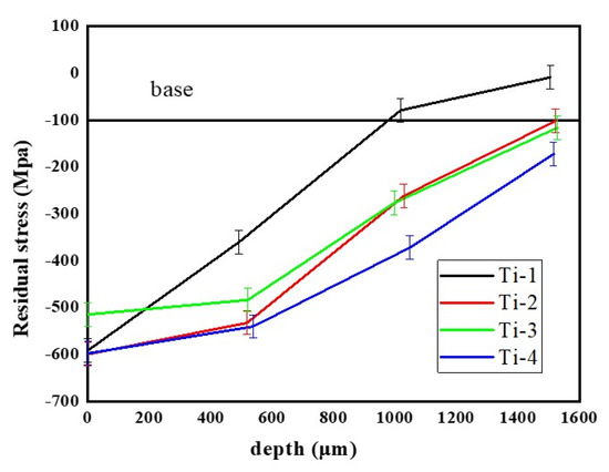 Along depth direction, the existence of compressive stress is limited owing to the presence of multiple grain boundaries and tangled dislocations []. The affected depth is about 1500 μm, indicating that the laser power along depth is to fade gradually. However, the Ti-1 sample’s impact depth of less than 1000 μm contributed to the deficient energy power. As Figure 7 indicates, when the energy power becomes sufficient, the Ti-2 sample has a similar impact depth of 1500 μm with Ti-4. The two impact number makes a strengthening action of surface, which is attributed to the energy maintenance. Since the energy power exceeds the limit of TC6, the surface compressive stress of Ti-3 is less than that of Ti-2. In general, for these four samples, the values of compressive stress decrease gradually in a shallow layer []. The shock wave propagated in material represents energy decay. The energy is consumed by the material and then transformed into deformation. Moreover, the decay rate intensifies in the depth direction.