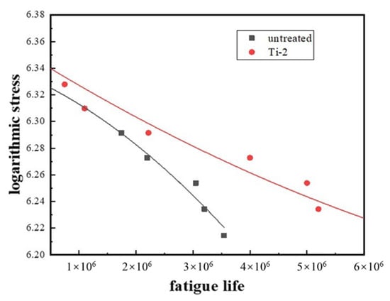 Ti-2, as the typical LSP sample, was selected for the simulation and experiment in order to discuss and analyze the failure mechanism under the condition of continuously alternating load. The loading stress was from 500 to 580 MPa and the value of logarithmic of vertical axis was utilized as a standard to measure the fatigue life. For the horizontal axis, the scientific enumeration is more suitable to describe fatigue life. At the same stress level, when the service life is longer, the value of abscissa is larger, as shown in Figure 8. This shows that under relatively low stress, the strengthening effect is more obvious []. Figure 9a,b shows that the stress distribution conditions and stress concentration areas of the untreated model are marked by red. The three areas with the highest equivalent stress are located at the fillet of the variable cross-section, while the stress in the remaining areas is lower [,]. This high stress area will greatly reduce the service life of TC6. After LSP surface strengthening, the high-stress area is located at the rounded corner, as in the untreated sample []. However, this FEM model reliably shows that the life of the frame beam can be increased under the same loading stress. Figure 9a,b displays that the logarithmic fatigue life is 6.54 and 6.90 for the untreated sample and Ti-2. The fatigue life has increased by 29% under 518 MPa loading conditions. In experiments, under the loading conditions of 500 and 540 MPa, the fatigue life of the specimens was increased by 35% and 16%, respectively. The results are comparatively close which confirms that the complexity of the sample would not influence the strengthening effect. In a frame beam structure, the LSP can strengthen the fatigue performance the same as a sheet structure, owing to the surface microstructures and residual compressive stress [,].