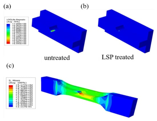 ABAQUS static results were imported into FE-SAFE software (version 2016) to calculate the fatigue life with the help of the Brown–Miller critical plane algorithm []. When the peak pressure of the laser shock wave exceeds the Hugoniot elastic limit () of the metal material, the fatigue performance of the metal can be effectively improved, the fatigue performance of the metal can be effectively improved.