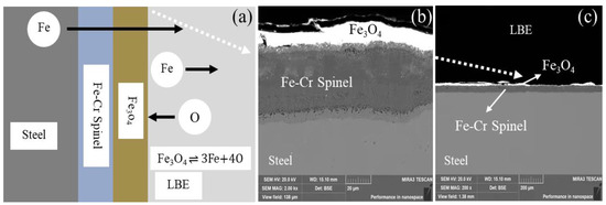 The corrosion mechanism diagram at the steel surface (a) and the surface of steel exposed to LBE at 500 °C in the oxygen saturation environment (b,c).