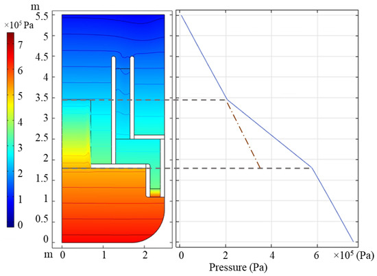 Meanwhile, the pressure of the primary circuit is calculated to verify whether the porous medium approximation is set correctly. The reference value of pressure is set to 0 at the top of the reactor. The pressure distribution in the primary circuit and on the line r = 0.1 m are shown in Figure 3, and we can see that the pressure decreases more quickly in the core and that the porous medium causes another pressure drop of 1.7 bars. Consequently, desired pressure drops are gained through porous medium approximation.