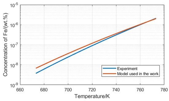 The concentration of Fe calculated by Equation (3) (Experiment temperature is from 673.15 to 773.15 K) [11] and Equation (4) (Used in the work) [1].