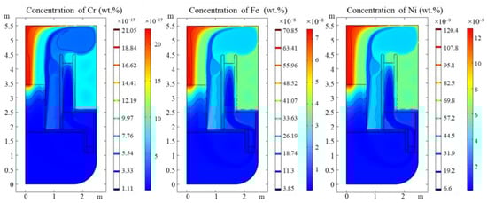 It was found that the maximum concentration of impurities occurs above the core because of the maximum temperature. The concentration gradient of Fe is also greater compared to other regions of the reactor, i.e., there is a greater possibility of forming solid particle oxides of impurity. It is mentioned in the introduction that the maximum Fe concentration calculated of MYRRHA is 4 × 10−7 wt.%, which is quite close to our results, which can sustain the validity of our simulation. There are no other experiments which measured the concentration of impurities in that their concentrations are lower than the detection limit available of a mass spectrometer [21].