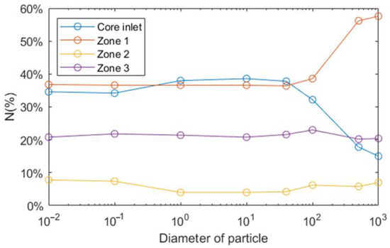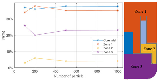 A few particles are randomly released in the whole primary circuit except the core. The release number should be set large enough to obtain a statistically significant simulation result. The circuit is divided into five zones, core, HX and zone 1 to 3, shown in Figure 6, and we count the particle number at the end time of simulation. When the particle number is greater than 500, the results vary slightly, which means that 500 is large enough to predict the behavior of particles. The reason for not using 1000 is that it would cost a large amount of computing resources.