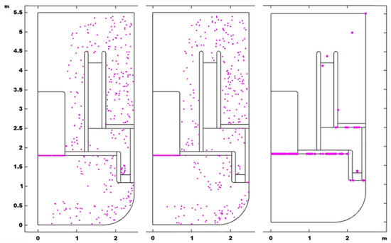 Final distribution of particles, dp 0.01 μm (left), dp 40 μm (middle), dp 1000 μm (right).