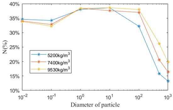For the investigation of particle size influence, the oxide particles are assumed to be spherical and eight diameter points are chosen to investigate, which are 0.01, 0.1, 1, 10, 40, 100, 500 and 1000 μm. The density of the particles is set to 5200 kg/m3. The final distribution of particles of diameter 0.01, 40 and 1000 μm is shown in Figure 7.