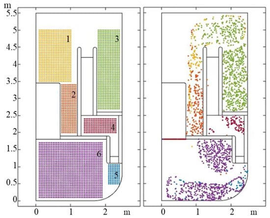 According to the previous section, the influence of density on the particle of a diameter smaller than 100 μm is not great, therefore the particles with a density of 5200 kg/m3 are taken as the research object. The initial position of the particles is divided into the following six regions. The regions are marked with different colors to distinguish them, and the particle distribution of the initial and final time are drawn, as shown in the Figure 10. To make the description easier, the particles released at different regions are numbered from 1 to 6.