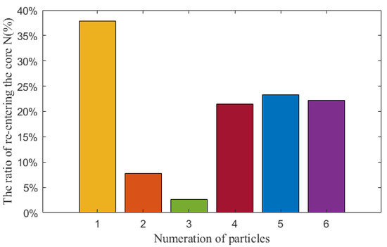 As shown in Figure 11, it can be obtained that the orange and green particles have a low probability of re-entering the core, while the particles above the core (yellow) have a higher probability of re-entering the core. We can see in Figure 2 that there are lots of stagnant regions where orange and green particles are formed and, for this reason, the particles are trapped by the eddies and they cannot re-enter the core while, for the particles formed above the core, they flow with the coolant and have greater possibility of re-entering the core. We can also see that the ratio of particles re-entering the core is not negligible, about 40% of particles formed above the core may re-enter the core, which stresses the importance of implementation of a purification system in the LBE reactor.