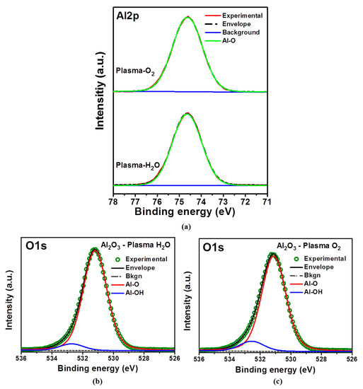 The chemical composition of both types of oxides was determined by XPS spectroscopy. Only one contribution was observed in the Al 2p spectrum of both oxides, while the O 1s spectra were deconvoluted into two contributions using a Voigt peak shape and a Shirley–Sherwood background (Figure 4). The contribution with greater area and lower energy is positioned at 531.18 eV and 531.11 eV for H2O and O2 plasma oxides, respectively. This peak is associated with the Al-O bond [19,26,30]. The contribution at higher energy, 532.70 eV for H2O and 532.55 eV for O2 plasma oxides, is attributed to the Al-OH bond [19,26,30]. The relative atomic contents were evaluated using the peak areas and the instrument sensitivity factors, 0.56 for Al 2p and 2.88 for O 1s. The ratio between total O and Al amount, in Al2O3 and Al (OH)3, and Al (Total O/Al) was found to be 1.48 and 1.50 for H2O and O2 oxidants, respectively (Table 4). However, the O/Al ratio corresponding to O in Al2O3 was calculated to be 1.39 and 1.36 for H2O and O2 plasma, indicating slightly off-stoichiometric oxides for both oxidants. Furthermore, the number of OH groups in the oxide grown with H2O plasma was smaller than that in the O2 plasma oxide (Table 4). This result is in contrast with what would be expected since the number of hydroxyl radicals in H2O plasma is higher. A greater reactivity of the H2O plasma compared to O2 plasma could be a possible explanation, in agreement with the results in [26]. Haeberle et al. [26] reported that, at temperatures below 80 °C, oxygen radicals are less effective in oxidizing organometallic precursors of aluminum in PE-ALD processes. The XPS results revealed high purity of the obtained Al2O3 films, and no carbon was detected.