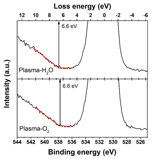XPS was also used to evaluate the oxide band gaps. The method is based on energy loss of high-energy electrons due to excitation of electrons from the valence band maximum to the conduction band minimum [31,32]. The O1s electrons were used as high-energy electrons for obtaining the band gap of the samples [33,34], since the onset of the scattered electrons does not overlap with the core level peaks due to the wide band gap of Al2O3. From Figure 5 values of 6.64 and 6.58 eV were determined for the oxides obtained with H2O and O2 plasma, close to those in [31].