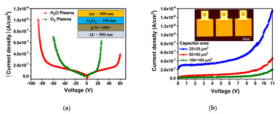 Figure 7a shows the absolute value of current density vs. applied voltage (│J│-V) characteristics of capacitors with 100 nm oxides deposited on Si substrates with O2 and H2O plasmas. The asymmetry in the │J│-V dependences in Figure 7a is due to differences in the conduction (ΔEC) and valence (ΔEV) band offsets between Si and Al2O3, ΔEC ~ 2.1–2.44 eV and ΔEV ~ 2.95–3.24 Ev [35,36]. For example, the current flow through the O2 plasma oxide started at electric fields of ~2 and −4 MV/cm at positive and negative bias voltages, while, for oxide obtained with H2O plasma, these values were much higher, ~5 and −7.5 MV/cm. The current at lower electric fields (before the beginning of current flow) was ~15 pA (│J│ ~ 10−7 A/cm2), indicating good insulating properties of the Al2O3 films. The breakdown electric fields for oxygen and water plasma oxides were found to be ~3 and 6 MV/cm at positive bias voltages and approximately −5.8 and −9 MV/cm at negative bias voltages, respectively. Since the current through the films deposited with H2O plasma starts at higher electric fields, i.e., the films are better insulators, this oxidant was selected for preparation of capacitors with 25 nm thick Al2O3 on ITO/glass substrates. Similar J–V characteristics as those for oxides deposited on Si wafer with H2O plasma at V > 0 were measured (Figure 7b). The current flow through the Al2O3 started at ~4 MV/cm, independent of the capacitor area, while values between 4.8 and 5 MV/cm were obtained for the breakdown field. The slightly higher breakdown electric field, as well as the field at which conduction through oxide begins, in the case of capacitor on Si wafer, is most likely due to native SiO2, formed by oxidation of the Si substrate in air before the Al2O3 deposition. The voltage drop on SiO2 was not taken into account when the breakdown voltage was estimated. The dielectric constant (k) of oxides grown with H2O plasma on ITO/glass substrate was determined by high-frequency capacitance–voltage (HF C–V) measurements at 100 kHz. Values for k between 6.3 and 7.6 were obtained (Table 5). It should be noted that the value for k determined from the 25 × 25 µm2 capacitor is higher than the values obtained from the larger area capacitors, which is most likely because of some error in the measurement of its very small capacitance, ~1.7 pF.