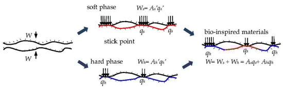 The adhesive friction of BHSIMs is a complex trait combining the individual properties of soft and hard phases, but also with mutual influence between these two phases (“real area of contact” of soft and hard phases in sliding process will influence each other). For BHSIMs here, we describe it by two scalar parameters, Young’s modulus Es (Young’s modulus of soft phase) and Eh (Young’s modulus of hard phase), which are the load per unit surface per relative elongation/compression of the chain for pure soft and hard phases. When a normal load is applied to the BHSIMs, the deformations of hard phase and soft phase per relative compression have to be similar within the sliding process, as shown in Figure 1, which results in a change in “real area of contact”, thus leading to the redistribution of the normal load.
