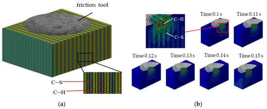 Finite element (FE) model of dry sliding process of BHSIMs. (a) FE model of BHSIMs, (b) Mises stress distributions sliding process at different timepoints.