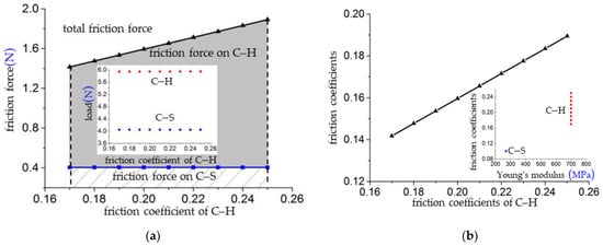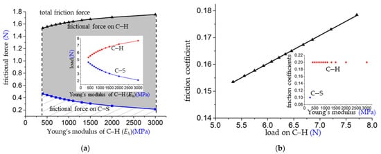 To better understand the effect of Young’s modulus of hard phases on the friction coefficients, a series of BHSIMs simulations were carried out and separate sets of data were obtained, in which the Eh was the unique variable ranging from 400 to 3000 MPa. The insets in Figure 3b is the variables and constants in the simulation (Es was selected for 270 MPa, and the friction coefficients of the soft and hard phase are 0.1 and 0.2, respectively). It can be observed in Figure 3a that the friction force on the hard phase (shaded area), as well as the total friction force (black line), increases as the Eh rises. Meanwhile, the friction force on the soft phase decreases with the increase of Eh. It is also found that the increase of Eh, also causes a redistribution in line with the findings from Figure 2, i.e., the higher the Eh, the more load on the hard phase (inset in Figure 3a). Figure 3b shows the relationship between the load on the hard phase and the friction coefficient based on the simulated output result, it can be observed that, with the Eh varying from 700 MPa to 3000 MPa, the friction coefficient of the BHSIMs linearly increases from 0.142 to 0.189, which can be interpreted by Equation (4).