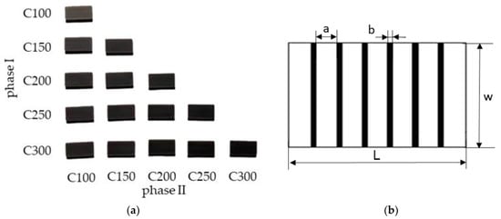 3D printing allows an easy fabrication of objects with complex geometries, making it a viable option for direct manufacturing. Thus, we have envisioned that 3D printing can be an attractive fabrication technique for the preparation of BHSIMs. Photographs of printed specimens are shown in Figure 5a, which verifies that BHSIMs can be readily achieved by a well-controlled 3D printing process. Herein, five compositions of printing material (namely, C100, C150, C200, C250 and C300 with Young’s modulus decreasing from C100 to C300) have been prepared by mixing different ratios of VisiJet CR-WT and VisiJet CF-BK, which represent the hard and soft components of the bio-inspired materials, respectively. Subsequently, a range of bio-inspired materials with integrated hard and soft layers (0.2 mm) have been fabricated by 3D printing. Specifically, we prepared a series of soft and hard layered bionic materials with a width of 15 mm, length of 30 mm, and thickness of 2 mm. As shown in Figure 5b, we define the stripe width of the soft material as “a”, and the stripe width of the hard material as “b”. As the color gradually gets darker from C100 to C300, the color of composts also changes from the upper left (C100/C100) to lower right (C300/C300).