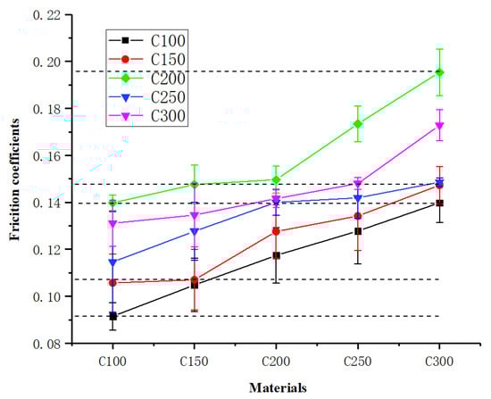 Specifically, as the friction coefficient of the constituting materials increases from C100 to C300, the friction coefficient of the bio-inspired composite material increases from C100/C100 to C300/C300 (Figure 6). It can be seen from Figure 6 that the friction coefficient of the soft and hard layered bionic material will change as the material properties of the hard material components change, which indicates that the elastic modulus Es and Eh, the friction coefficients fs and fh of the hard layered bionic materials in the soft and hard materials are the main factors affecting the friction coefficient of the soft and hard layered bionic materials. The experimental results coincide with Equation (4).
