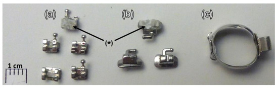 Representative orthodontic components used in this study: (a) brackets, (b) tubes, and (c) band (with attached tube). The resin-covered bases of a bracket and a tube are highlighted (*).