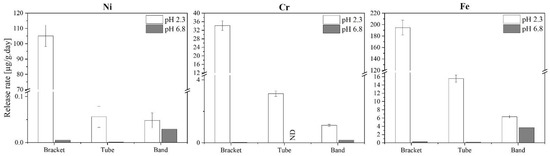 The ICP results of orthodontic SS components are summarized in Table 3, and Figure 2 shows the metal release rates, as a function of the artificial saliva pH. Three main conclusions arise from the analysis of these corrosion data: