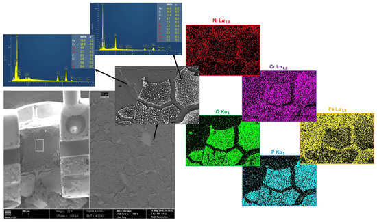 Tubes presented no signs of localized corrosion in either pH value. AISI630 SS is a precipitation-hardened alloy (martensitic structure) with high mechanical strength, high hardness, and excellent corrosion resistance, superior to the other austenitic SS studied grades. In fact, corrosion rates for Fe were almost 13 and 10 times lower than for brackets, and only traces of Ni were detected by ICP (Figure 2). Notice that this SS grade is the only one that presents the element Cu in the nominal composition (see Table 1), contributing to the Ni equivalent effect. However, in the acidic saliva (pH = 2.3), SEM examination, coupled with EDS analysis (Figure 4) exposed traces of an outer layer with O, Cr, and P. Like in the case of brackets, this acidic condition influenced the adhesion of the passive layer. Notice that this “alveolar”, loose layer morphology contains higher P content (~13 wt.%) than in the case of brackets.